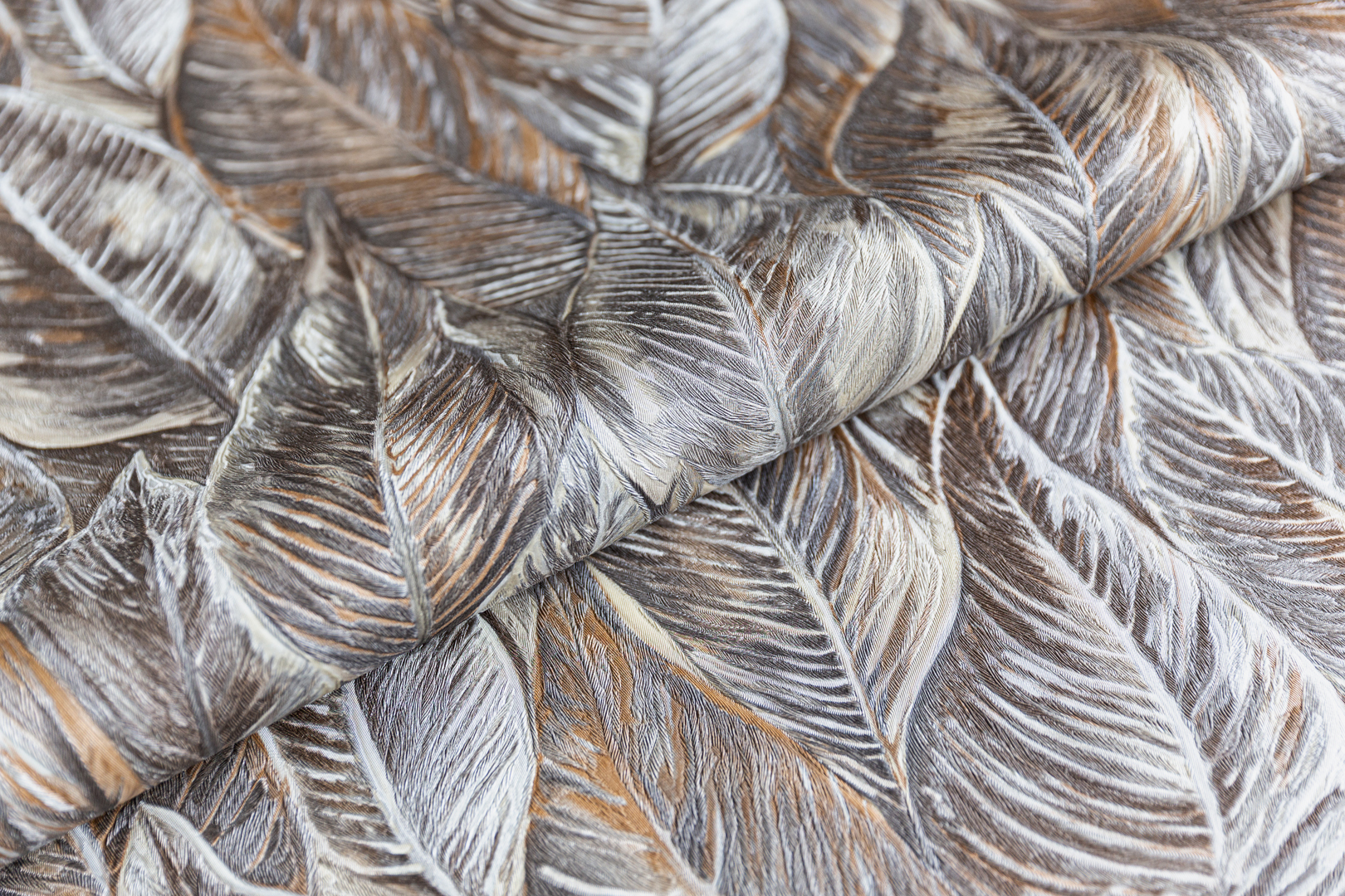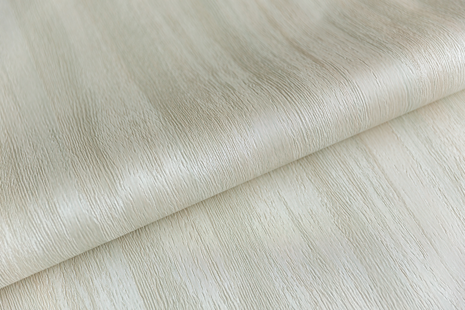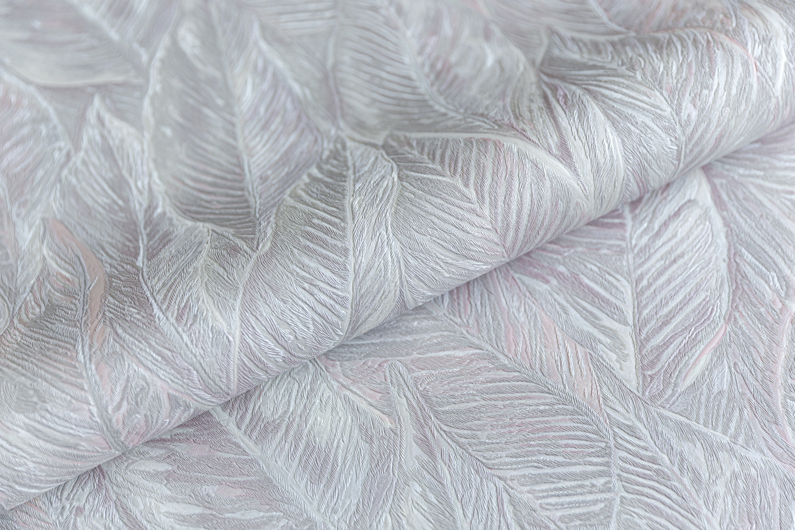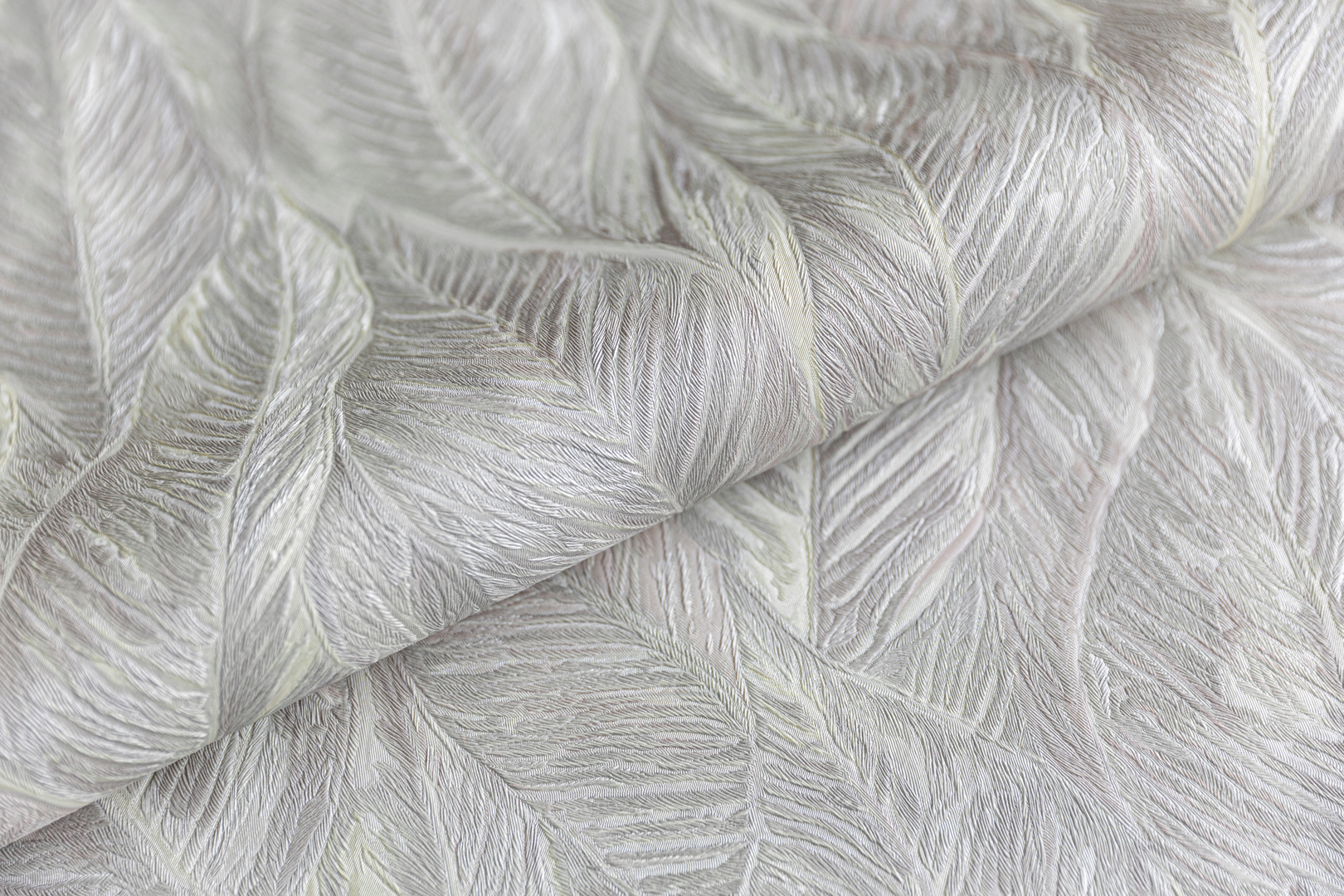 В каждом из пяти мотивов можно отметить сразу несколько близких тонов, переходы цвета между ними придают изображениям дополнительную глубину. Благодаря деликатному перламутровому блеску поверхность обретает особый шарм. Текстура фоновых обоев основана на нейтральном рисунке продольного древесного спила. Как и в случае мотивов, тиснение выглядит очень естественно и простыми штрихами создаёт природную гармонию.