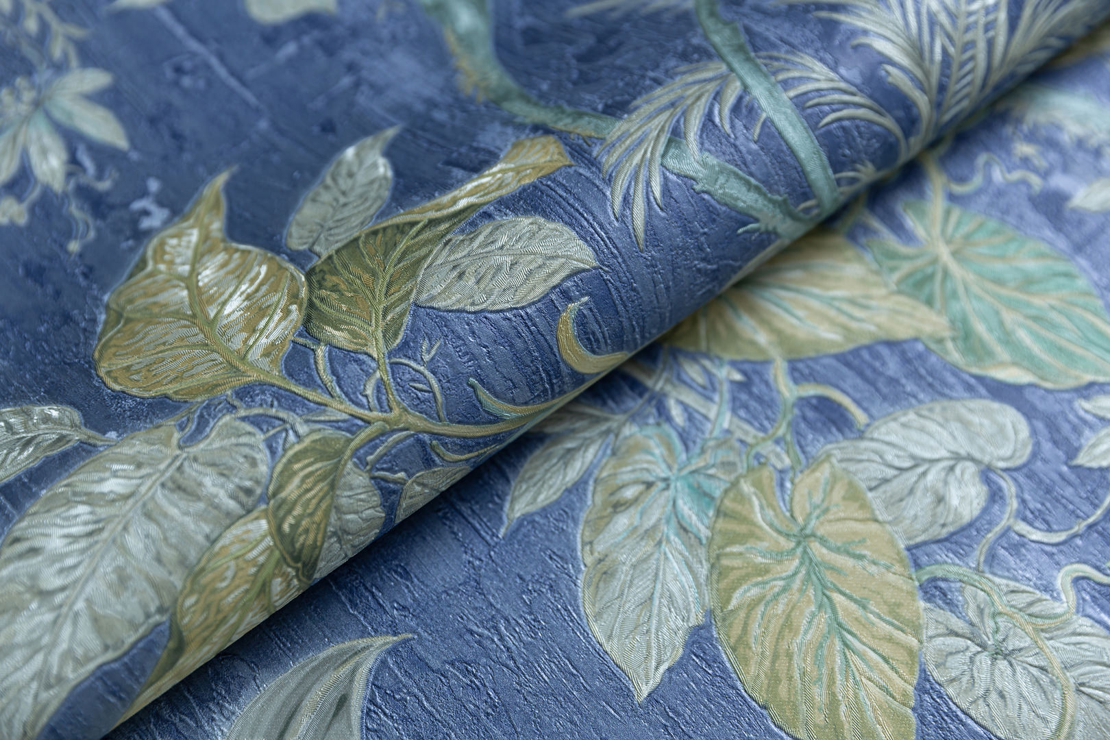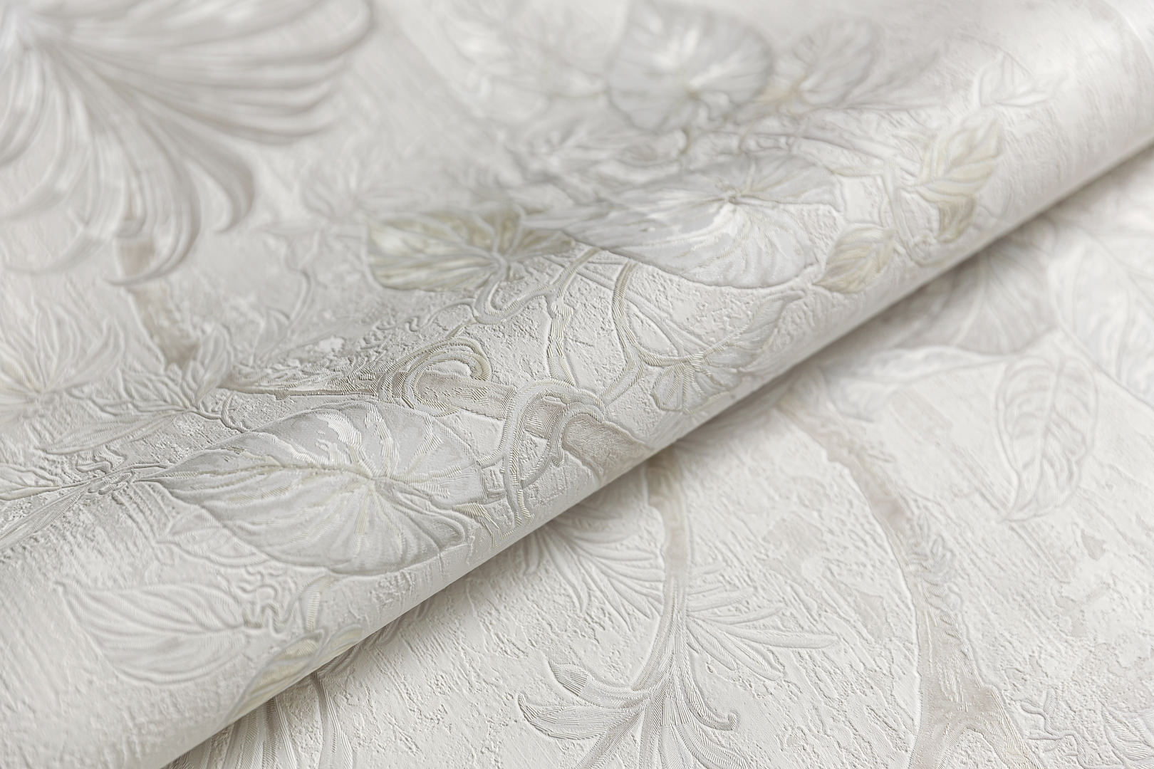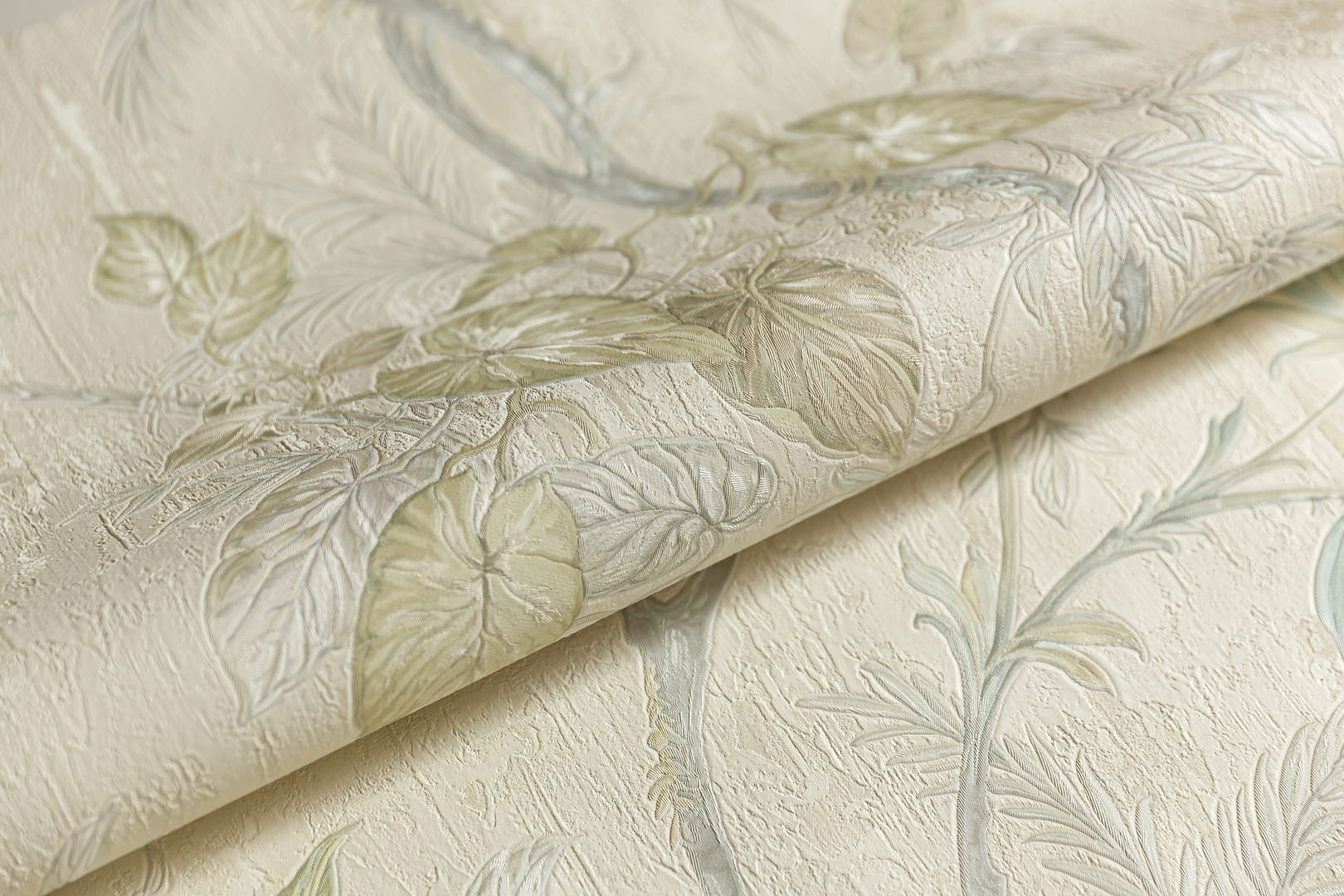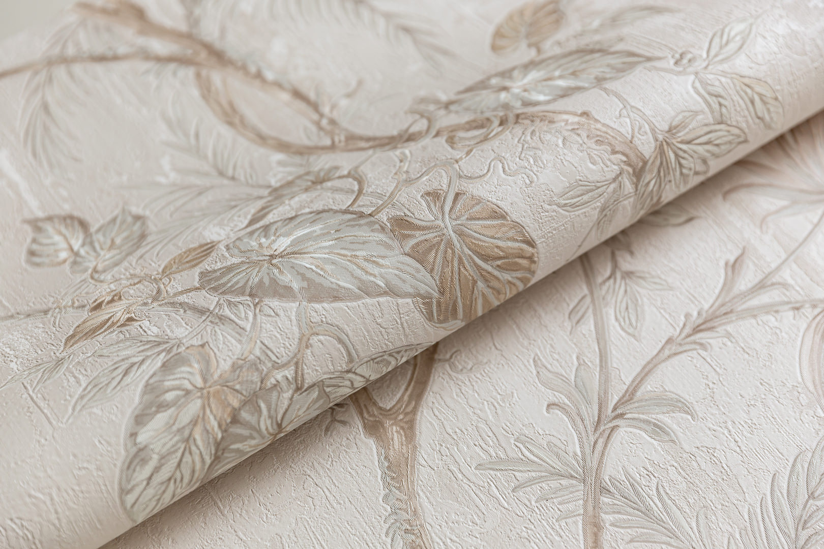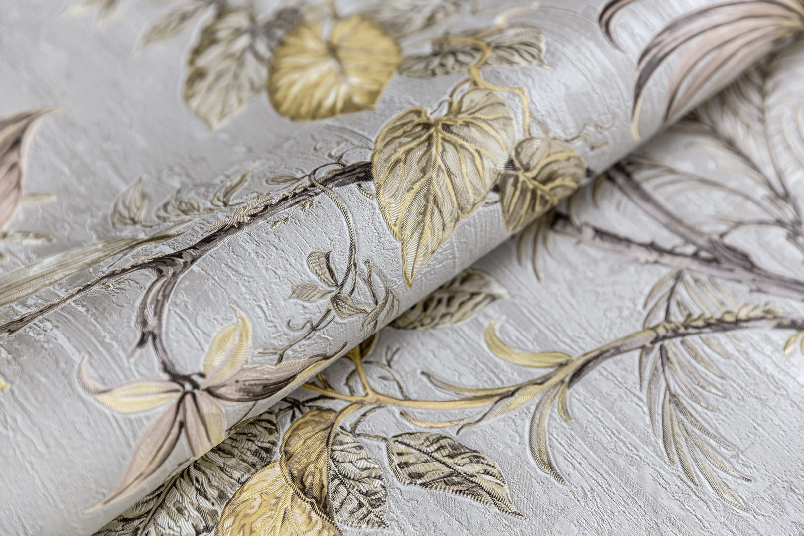 Для любителей спокойных сочетаний в «Оранжерее» есть несколько пастельных вариантов мотива. В каждом случае листья выполнены с богатым тиснением, с добавлением золота и серебра. На фоновых обоях тоже сделано тиснение, создающее эффект декоративной шпаклёвки.