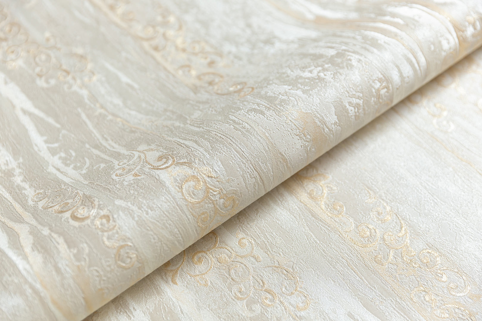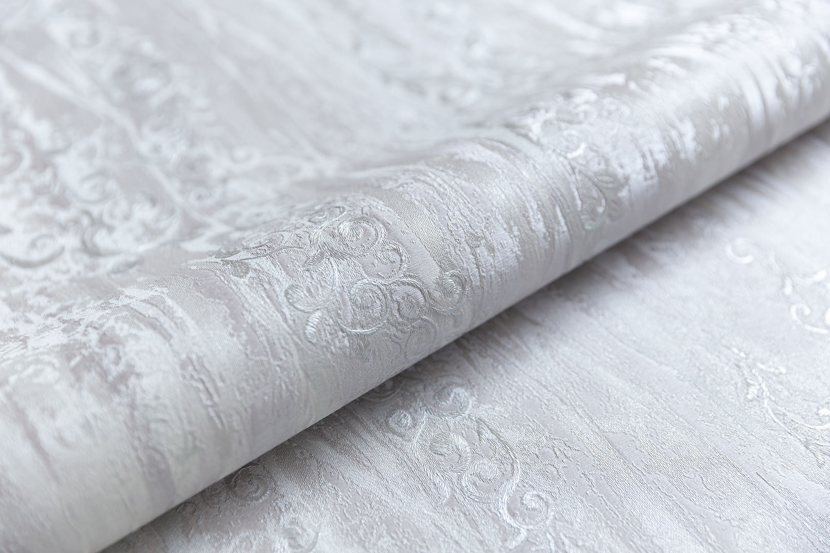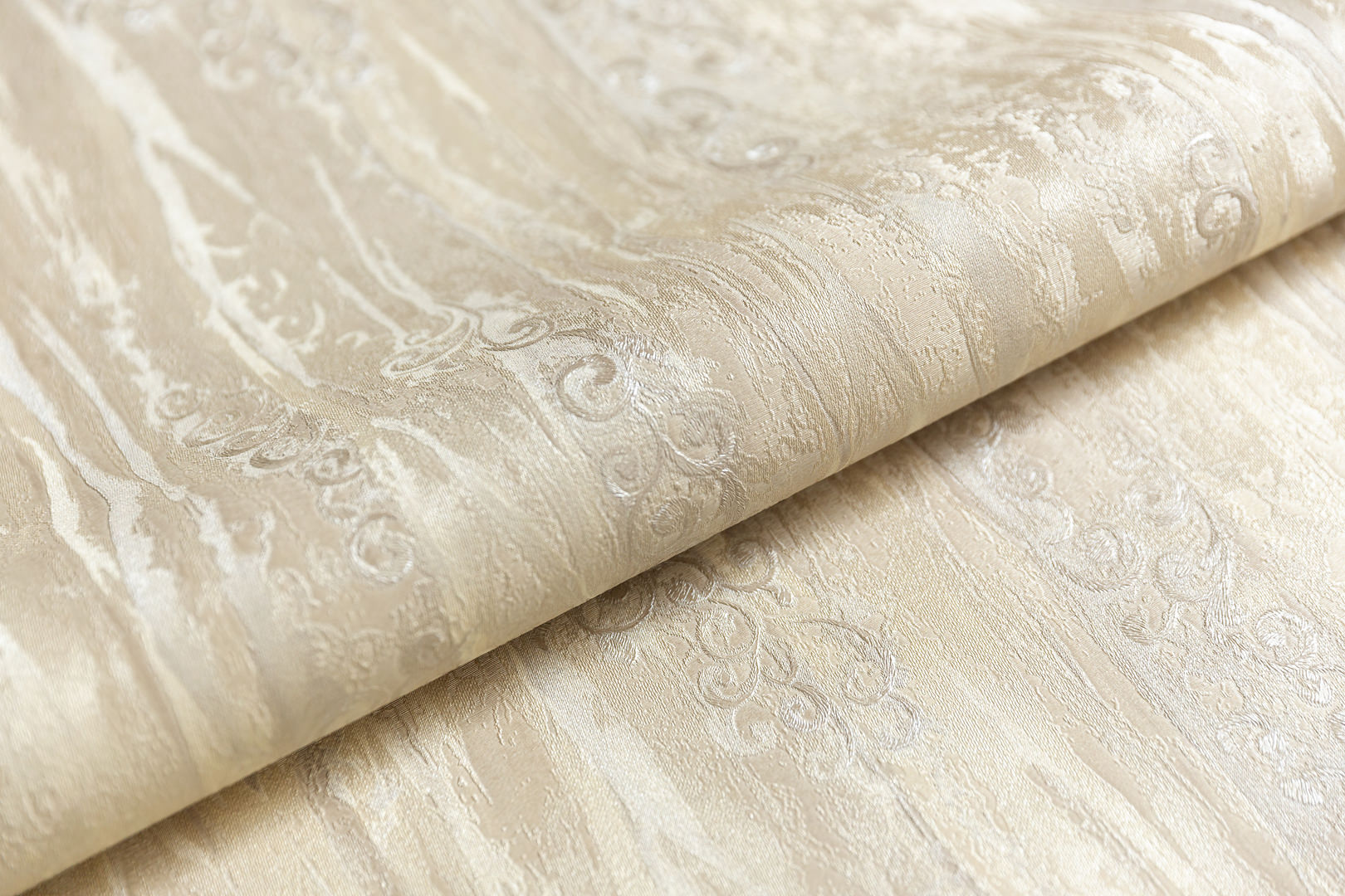 Современная классика, решённая в спокойных, приятных для глаза оттенках, смотрится на стене деликатно и вместе с тем интересно. Каждый из пяти вариантов мотива напоминает итальянскую ткань с вышитым узором. Флористический рисунок на обоях выделен тиснением с эффектом аккуратных стежков.
